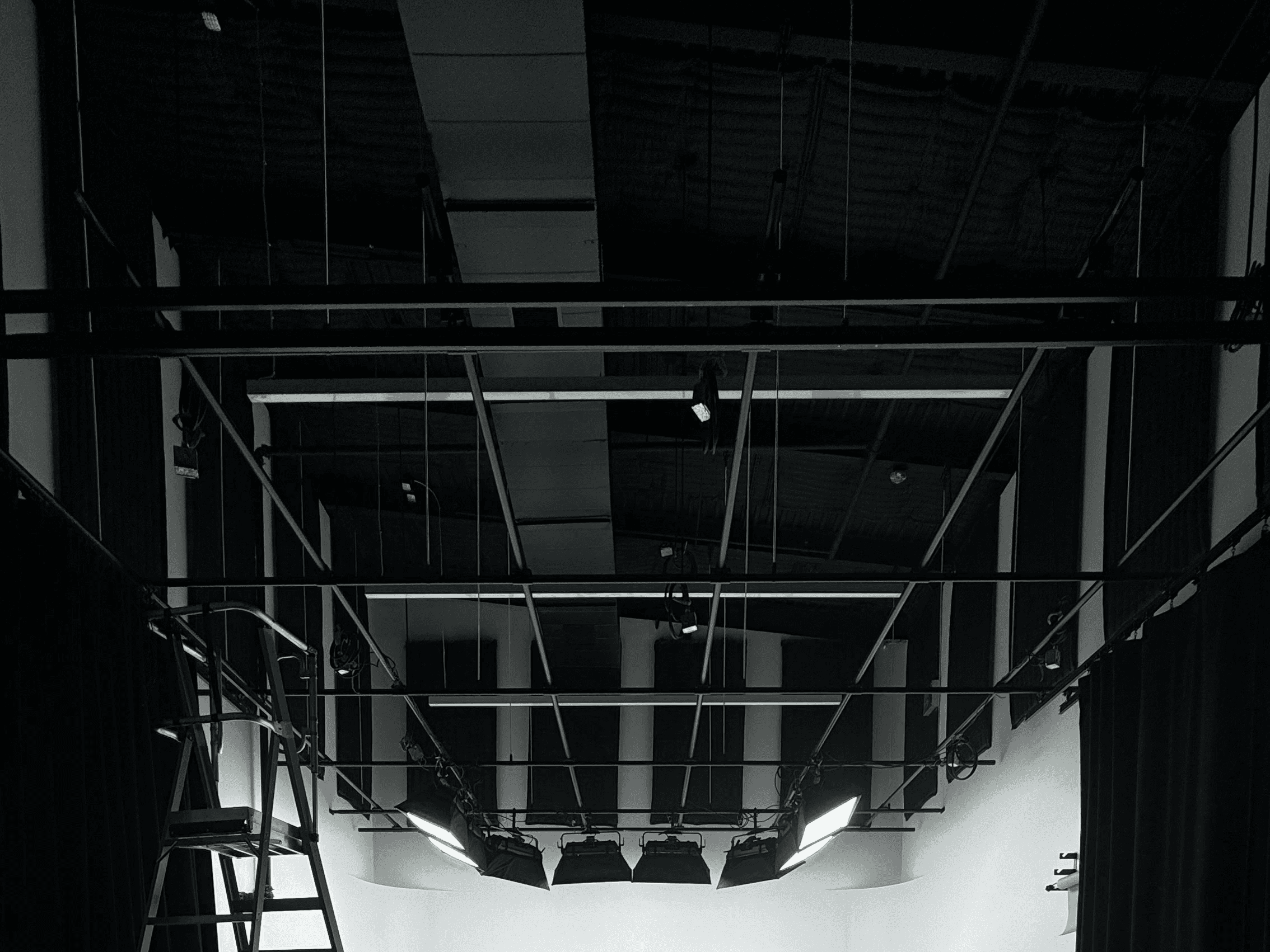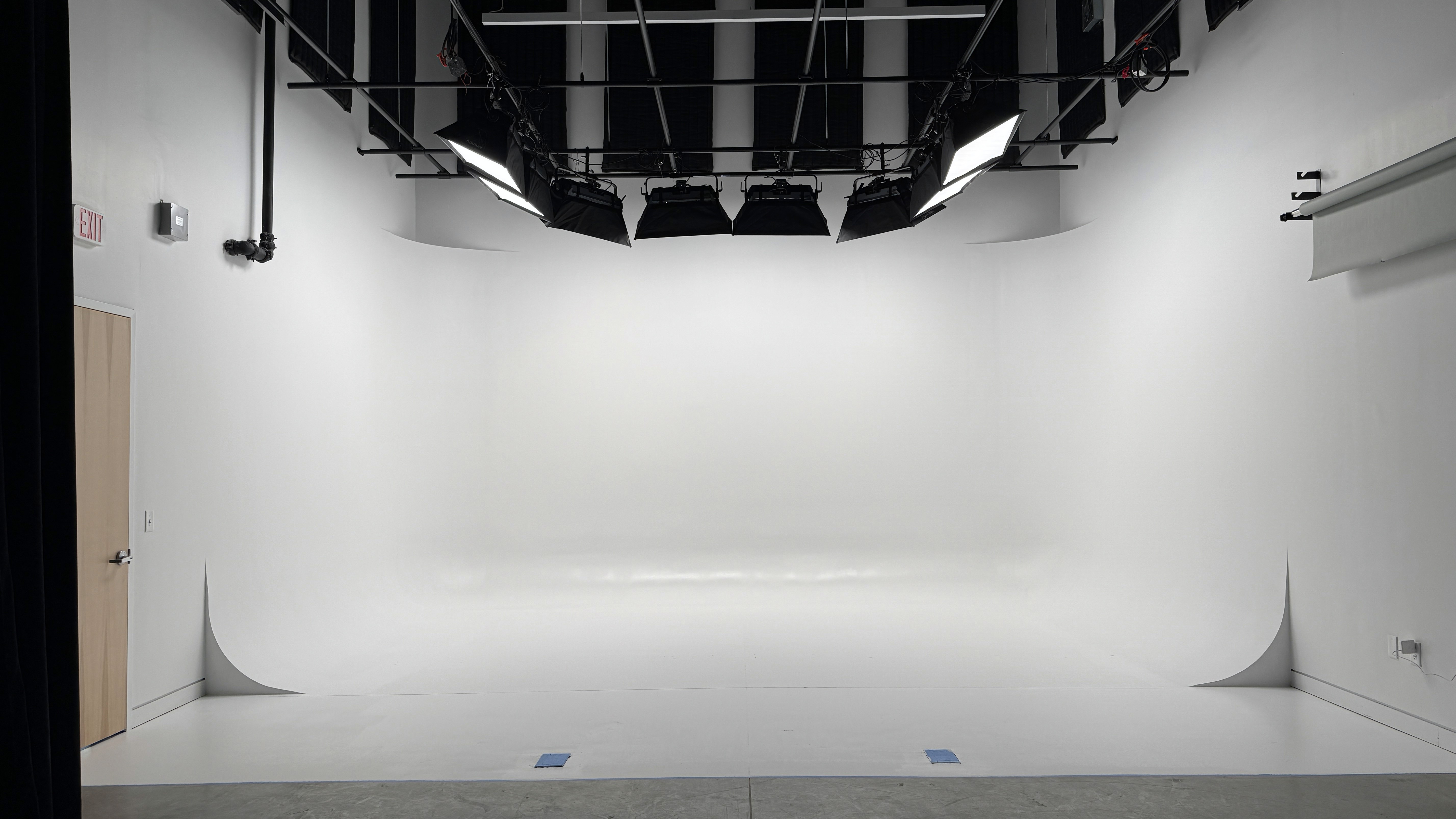 Our three-wall cyclorama is pre-lit by 9 Aputure Nova P600 lights with softboxes, this space offers seamless control over brightness and color for each light via an iPad—no ladders required.